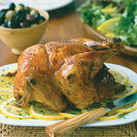 6. Выньте из духовки и оставьте на 10 мин. Слейте сок с противня в соусник, переложите курицу на блюдо и подавайте вместе с соусом.